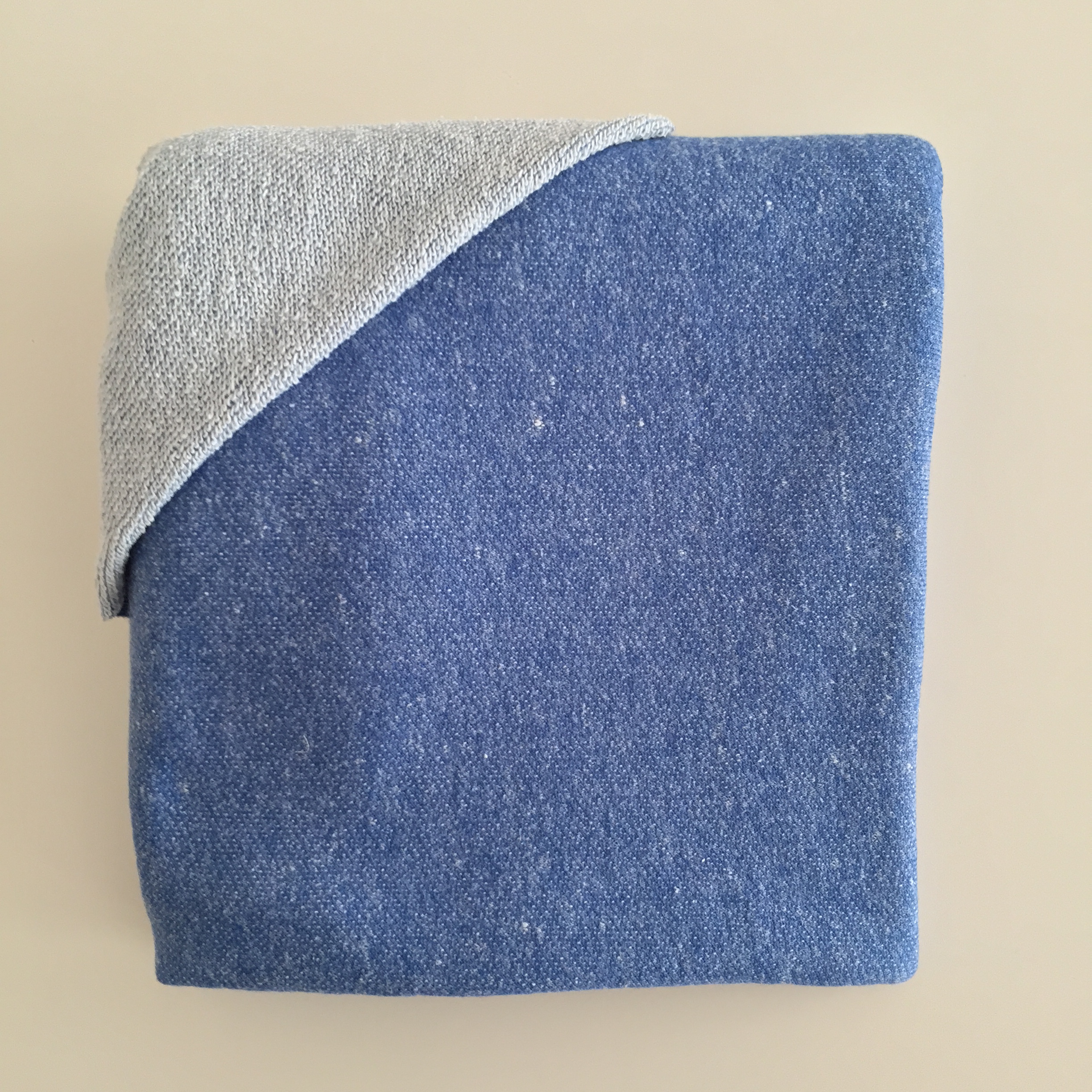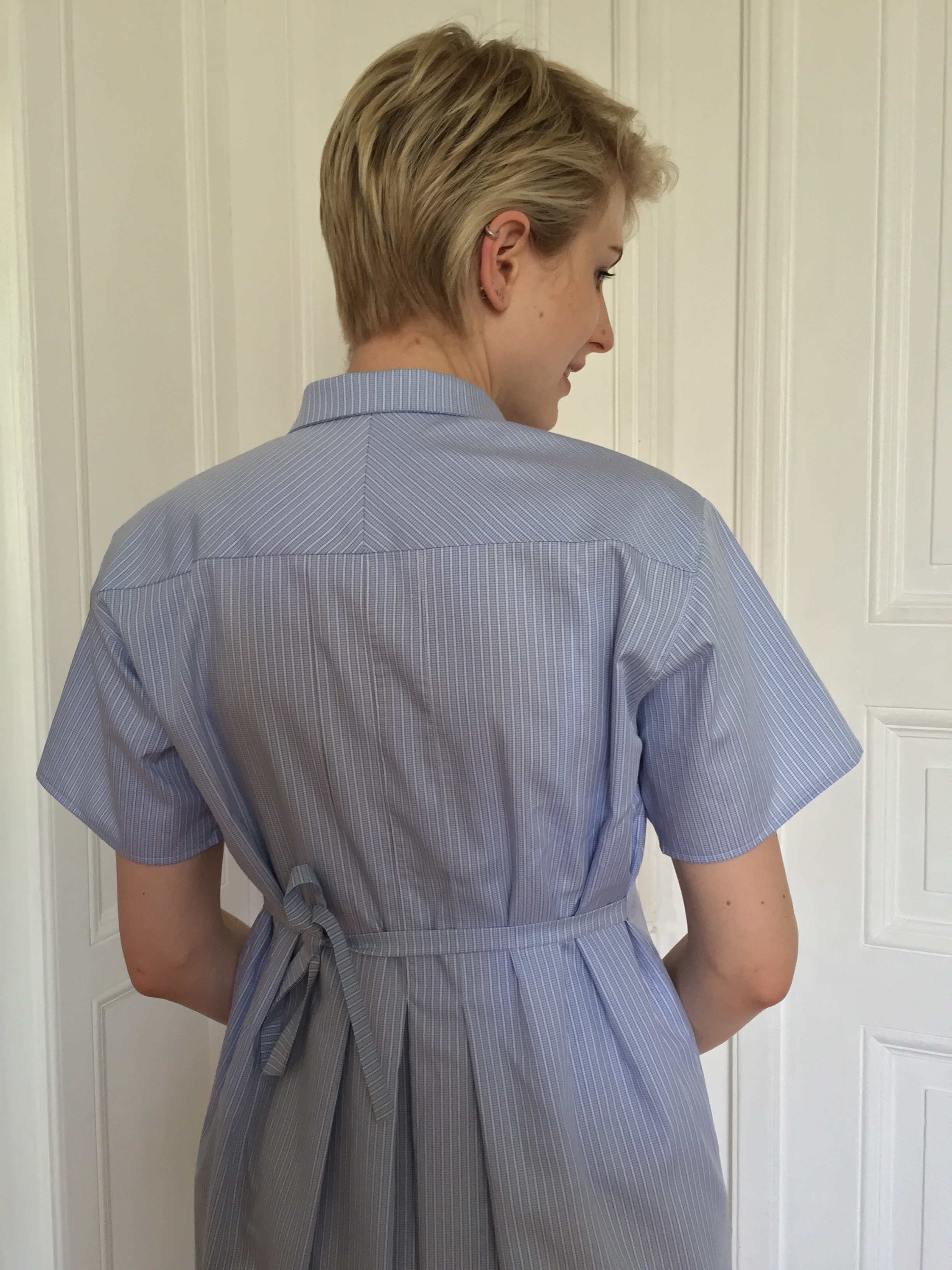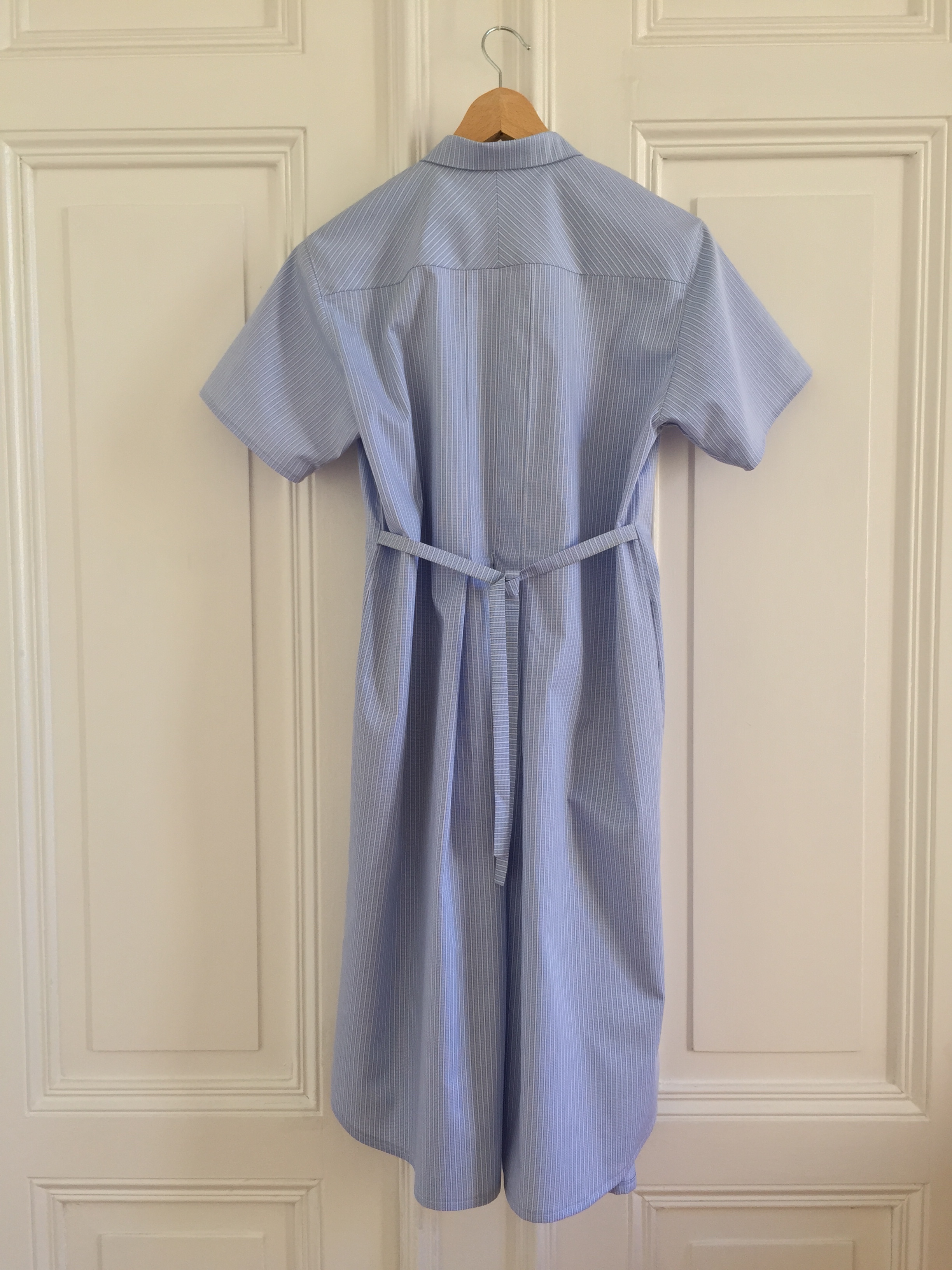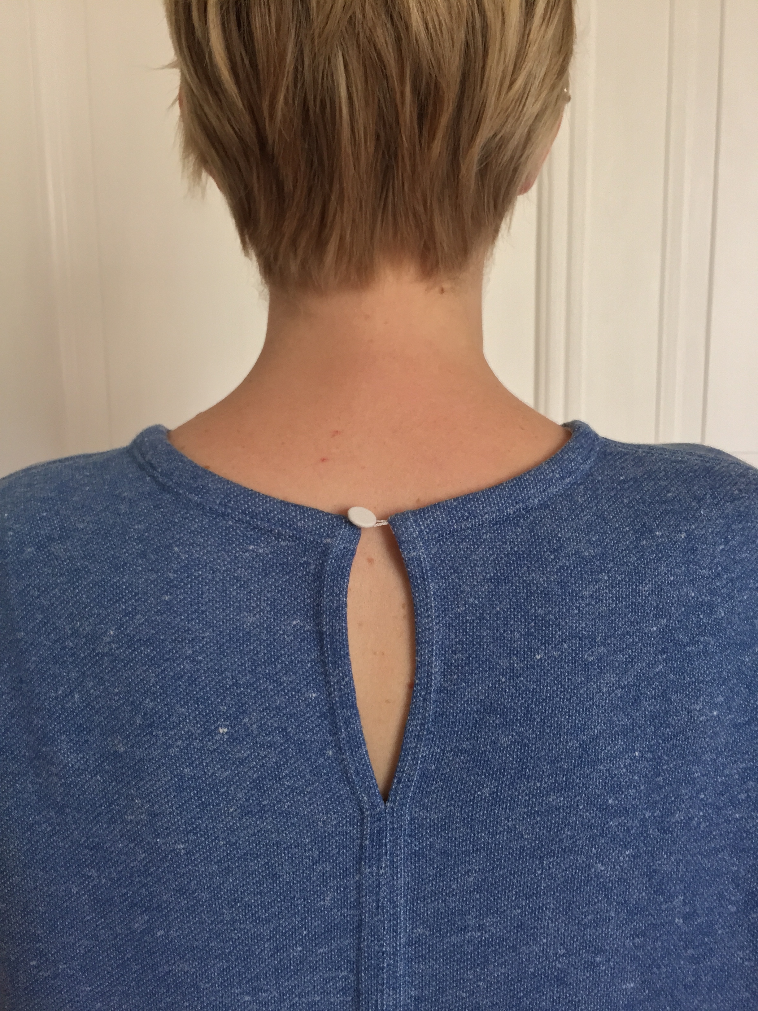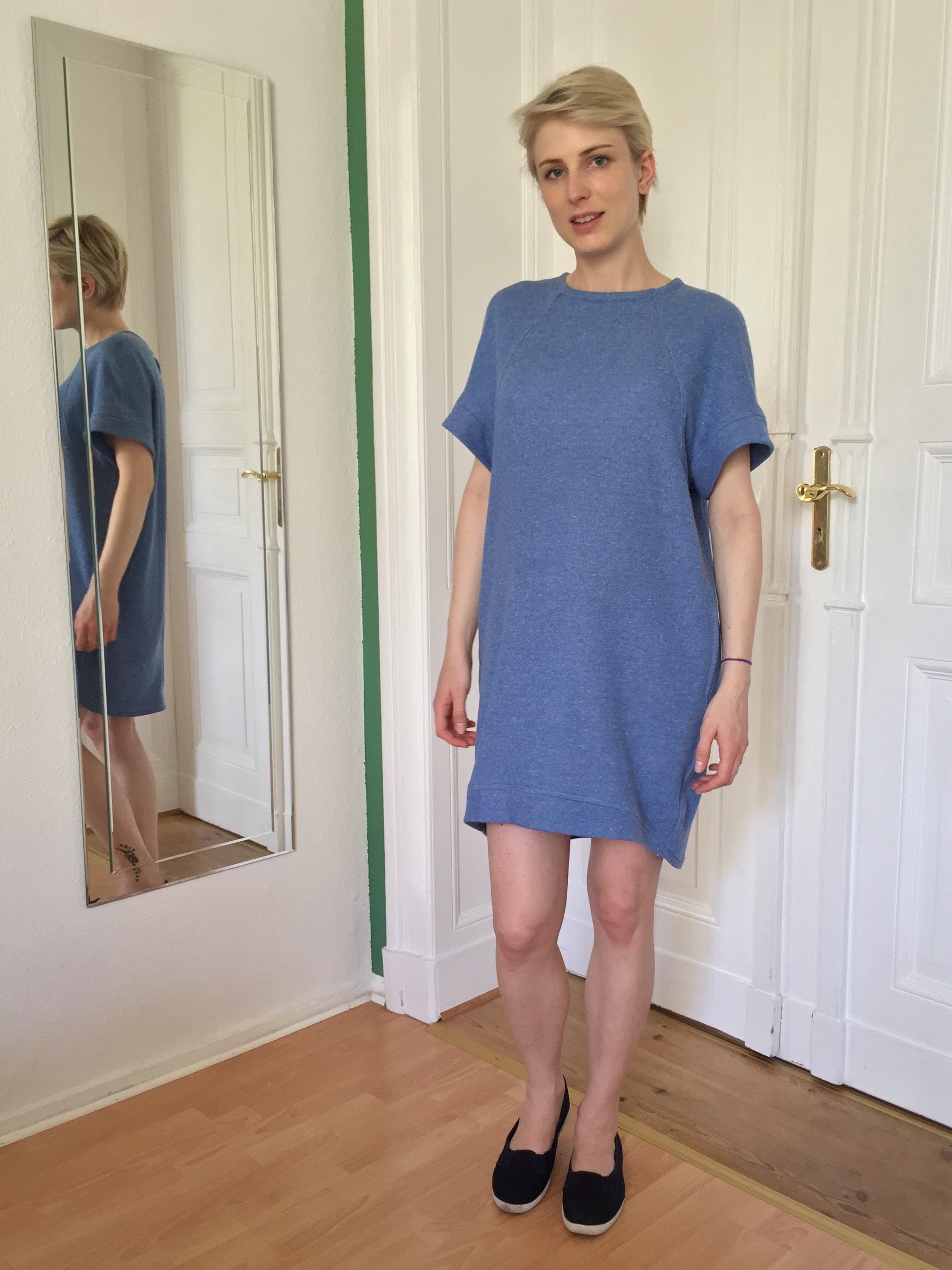 This dress was tinkered with a bit, too. The suggested fabric was a washed silk, which, as you can see in the picture, looks lovely. However, the purpose of this dress was to have something everyday and easy, and so we went with a sweat jersey. There is a bit of a theme going on with the colour, I guess. But why not? Light blue is a great colour on Gabriele – it’s a great colour full stop. Besides easy care the fabric has other advantages: the loose knit allows the skin to breathe, but has enough stand to skim the body, rather than cling.